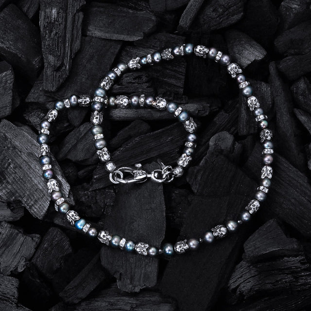 Indulge in the charm of this unique necklace accentuated by dainty 5 mm black or white pearls , nestled among three symbolic small skulls. Elusive yet entrancing, this item radiates elegance and beckons you on a quest of exploration. Allow your fashion to speak volumes with this alluring Silver and Pearls necklace, ideal for those seeking to make a daring declaration. Tap into your inner fairy essence and elevate your style to unparalleled levels.