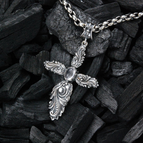 Silver Pendant MAGIC PLANT Cross and OVAL ROSE QUARZ 70