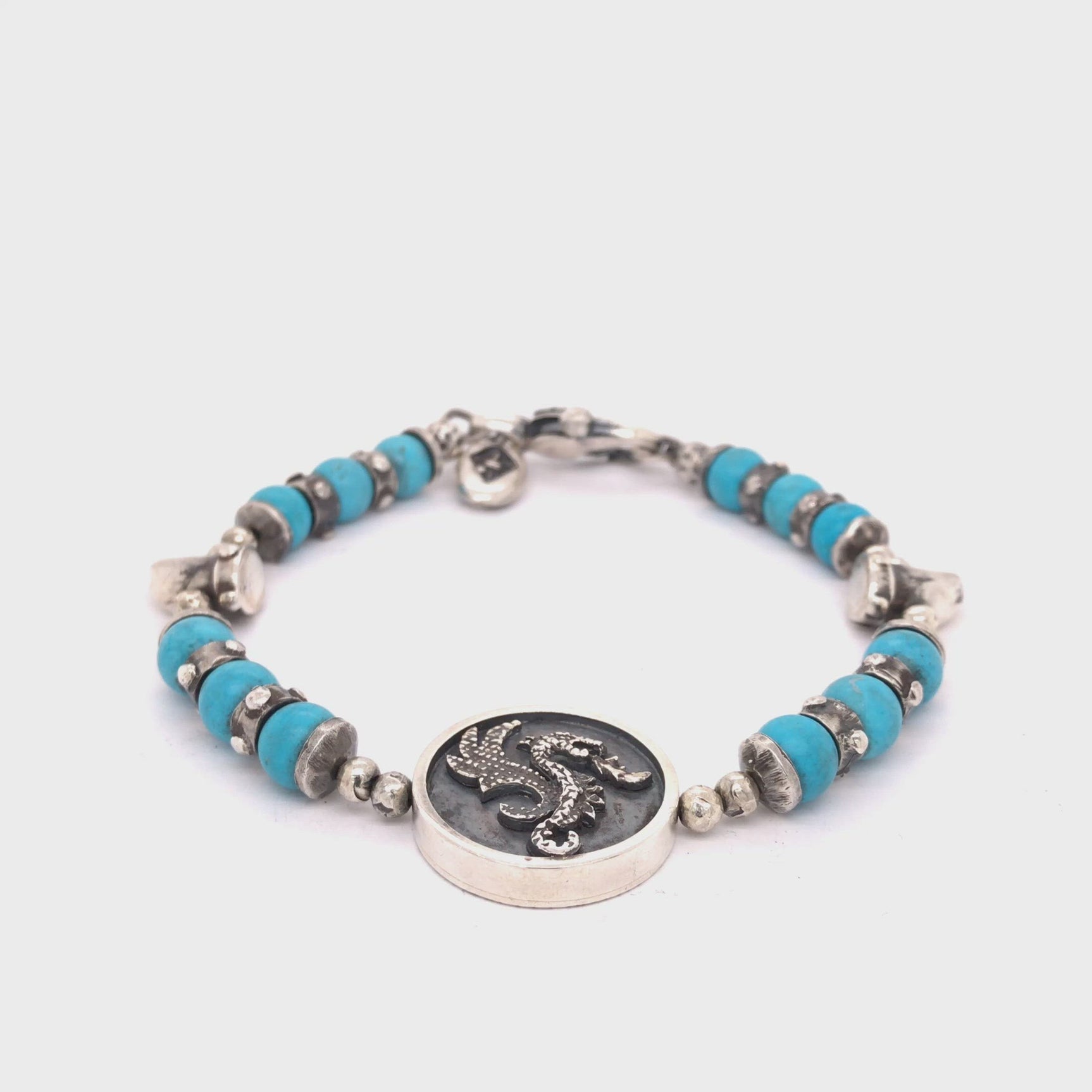 Silver Bracelet Beads and Silver Dragon Coin and Teeth with Silver Carabiner with turquoise and coral beads 20 cm  or only turquoise 21,5 cm