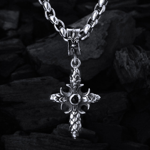 Behold, an exquisite silver pendant in the form of a crescent cross, adorned with intricate dragon scale detailing and bejeweled with a 40mm silver cross encrusted with black or white zirconia and a loop.