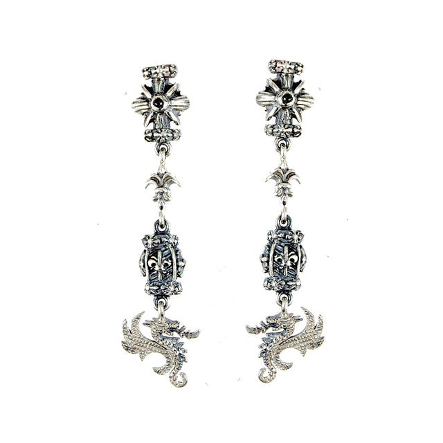 An elegant 10 cm silver earhanger boasting the Morning Star, Lily Barrel, and Dragon Fire designs creates a stunning look of sophistication.