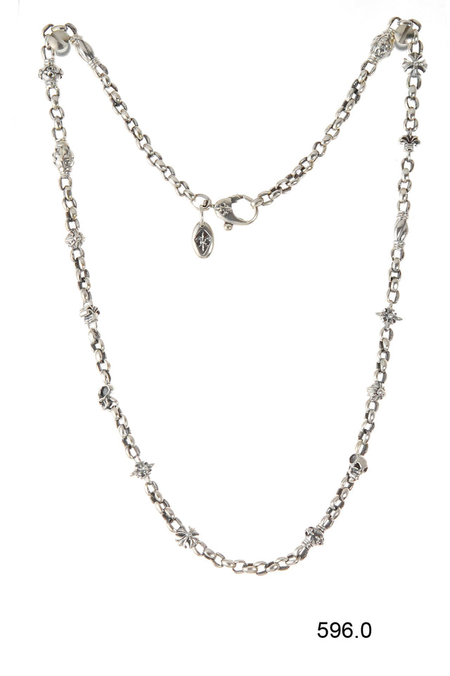 Silver necklace with mini Skulls, Lilies, Balls and Morning Stars. This timeless piece of jewelry adorned with intricate details is an effortless way to upgrade your wardrobe and add a touch of luxury to your look.