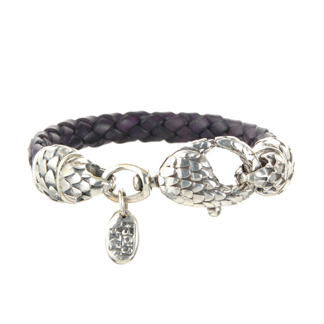 This exceptional Silver-Leather Bracelet DRAGON SCALES Carabiner is crafted from 10mm oval braided leather in an array of chic colors--black, brown, olive, and violet--and is available in customised sizes between 18.5cm and 22.0cm in total length.