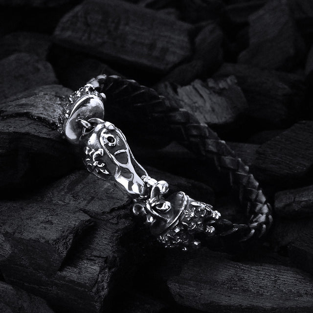 Make a strong impression with this Silver-Leather Bracelet featuring an eagle skull, silver clasplock, and an eye-catching silver lilies and crown end for 10mm braided leather.