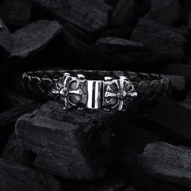 Silver-Leather Bracelet Malteser Cross with Meteorite Faceted Silver Jointlock 10