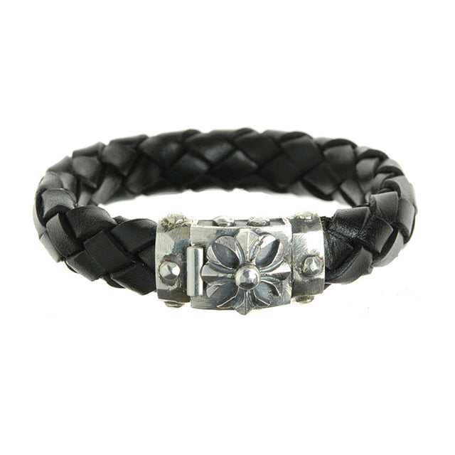 Adorn yourself with this luxuriously crafted silver-leather bracelet, fashioned with a Malteser Cross faceted boxlock and a meteorite accent, designed to fit 13mm braided leather.