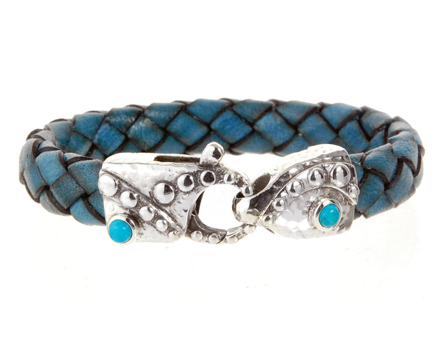 This stylish silver-leather bracelet features a lobster claw lock, hammered to perfection with two turquoises for a happy colour finish.