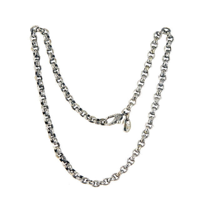This exquisite silver neckchain, featuring XXS chain and an XS carabiner with a hammered texture, is designed with luxurious elegance. Its sumptuous construction imbues it with an air of sophisticated exclusivity.