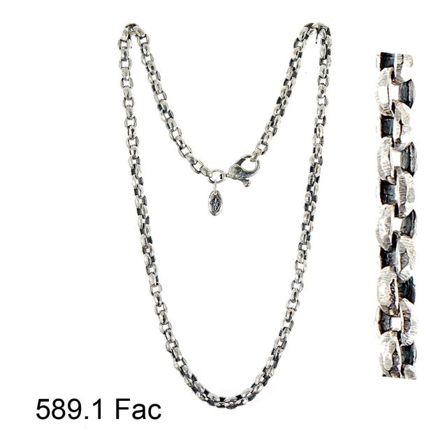 Crafted from 925 Sterling silver, this handmade chain boasts a rough faceted design and is secured with a carabiner. Boasting an XS link of 7.0mm, it makes an enchanting statement.