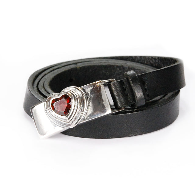 Featuring a silver clasp adorned with a red zirconia heart, this 70cm black leather band elegantly wraps around your wrist.