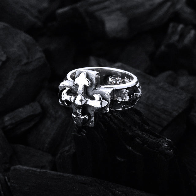 Silver ring band with small lance, smith and blades crosses and a Greek Blades Cross on top. Welcome to the mid age. Live the chivalric lifestyle of the Middle Ages with this unique and stylish silver ring band. Conquer your kingdom with confidence, knowing you've got the perfect accessory.