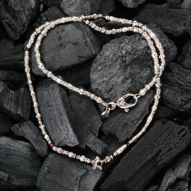 Delight in the intricate detail of these finely-crafted sterling silver tubes and mini balls, with a striking star -- our sun -- in the center, encrusted with 0.25 ct. black diamond (or, alternatively, a champagne diamond or citrine). Surrounding the sun are the other planets, each expressed in its own true-to-scale hue: black diamond beads, a sapphire for Earth, and a ruby for Mars.