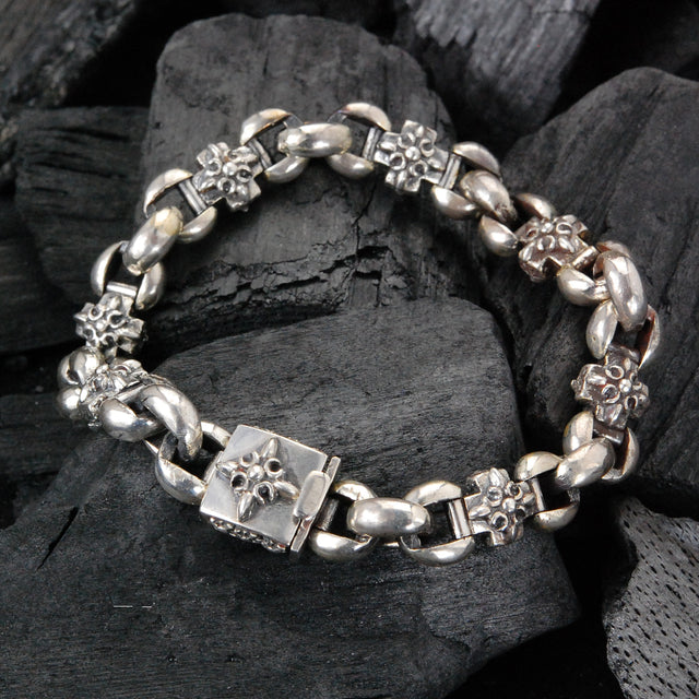 Silver Bracelet CRESCENT STAR CROSSES + BOX LOCK on PEA Chain Faceted showcases exquisite craftsmanship with a refined pea-link chain in sterling silver. The bracelet features a unique crescent star box lock, enhancing both its security and elegance, while delicate crosses add a subtle yet striking detail. Its faceted finish catches light beautifully, making this piece an enduring symbol of sophisticated style suitable for any occasion. Designed to elevate your look with timeless luxury, this bracelet blends classic motifs with modern precision, perfect for those who appreciate understated refinement in their jewelry collection.