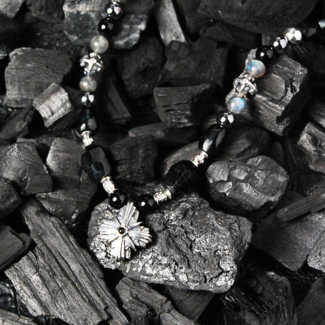 Türkise Steine und Perlen, Lava, Granat, Labradorit und Afrika. Türkis mit einem griechischen Morgensternkreuz in der Mitte.