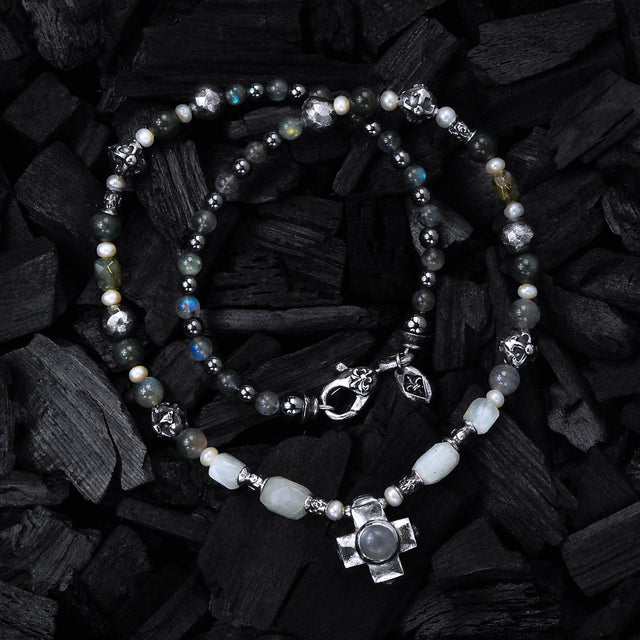Tragen Sie die Halskette ROCKS and BEADS mit silbernen Röhren und Kugeln und dem GRIECHISCHEN RUNDSTEINKREUZ und zeigen Sie der Welt, dass Sie bereit sind, Risiken einzugehen. Diese stilvolle Halskette kombiniert elegante Silberröhren und -kugeln mit gewagten Steinen und Perlen und sorgt so für einen Look gewagter Abenteuer. Scheuen Sie sich nicht, mit diesem Statement-Stück, das mit einem atemberaubenden griechischen runden Steinkreuz verziert ist, einen Vertrauensvorschuss zu wagen.