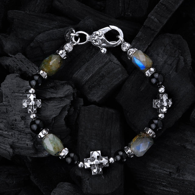 Silberarmband BLADES CROSSES und LABRADORIT ROCKS mit schwarzen Perlen