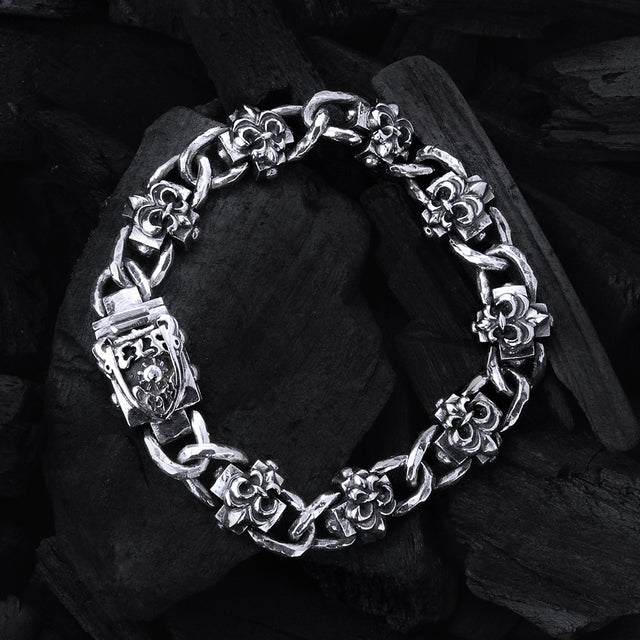 Schmücken Sie sich mit einem gewagten 12-mm-Silberarmband mit griechischen Lilienkreuzen und einer facettierten Kette mit Wappen-Boxlock und Meteorit-Finish.