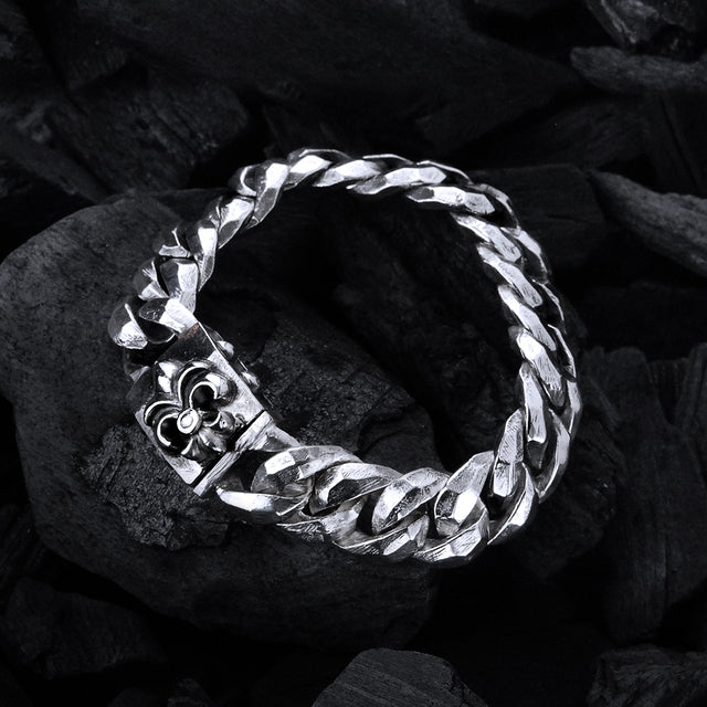 Grob facettierte schwere Panzerkette mit Lilien-Boxlock mit Meteorit. Dieses elegante und auffällige Stück setzt ein mutiges Statement und wird bei allen Betrachtern die Bewunderung auf sich ziehen. Hergestellt aus den besten Materialien und mit viel Liebe zum Detail ist dies ein Accessoire, das anspruchsvolle Geschmäcker anspricht.