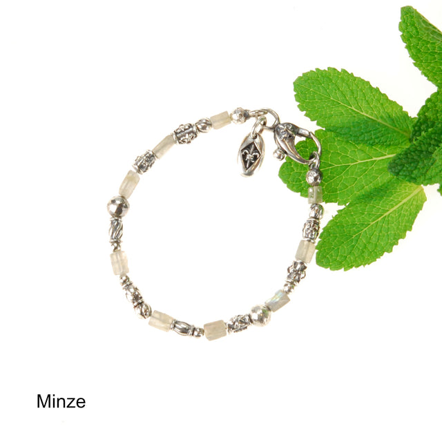 Dieses Silberarmband ist mit Symbolen im Elfenstil gestaltet und verfügt über sieben mal fünf Millimeter große Miniröhren und Minikugeln, die alle aus Sterlingsilber gefertigt sind und ein schlankes, aber schweres Stück ergeben, das durch mehrere quadratische Labradoritstäbe und einen anmutigen Karabinerverschluss mit Lilie ergänzt wird.