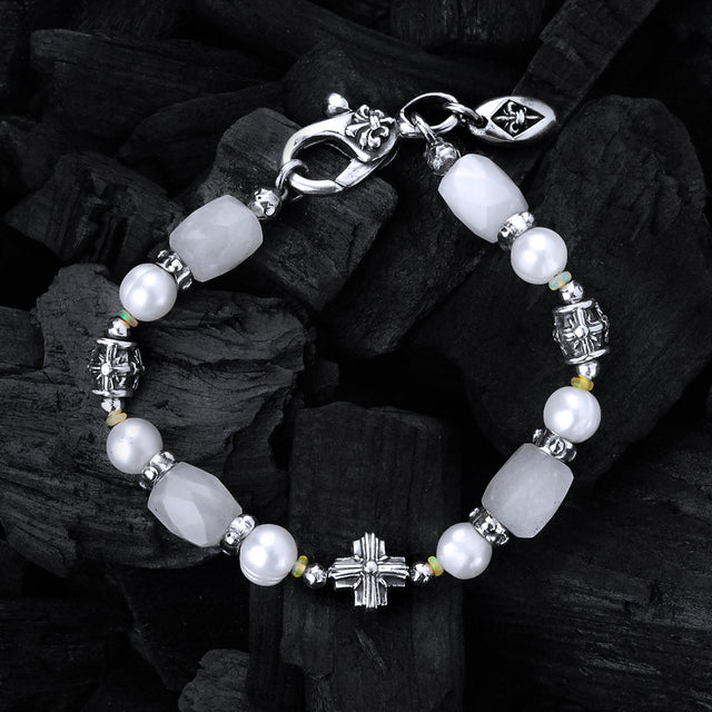 Silver Bracelet MORNING STAR CROSS and MOONSTONE ROCKS with Pearls and Opals