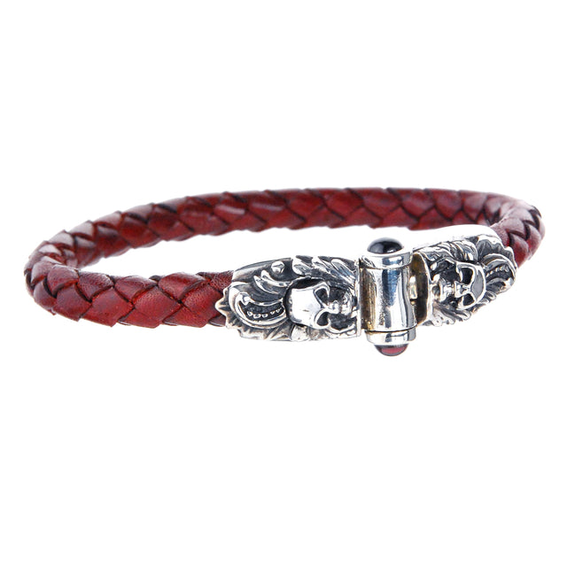 Dieses luxuriöse Silber-Lederarmband, verziert mit zwei Cabochon-Steinen und besetzt mit Magic Plant- und Silver Jointlock-Totenköpfen, ist das perfekte Accessoire für 7-mm-Leder.