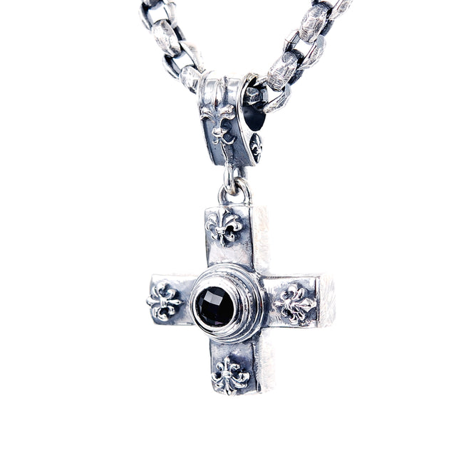 Silberner Anhänger mit griechischem Kreuzkörper mit elfenhaftem Steinhalter und Lilien