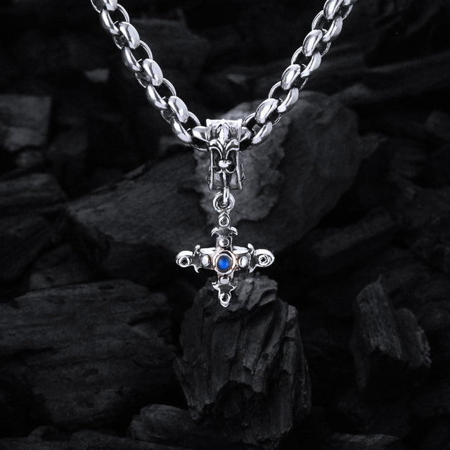 The Smith Cross pendant, crafted in 18mm sterling silver, features four elegantly set black diamonds surrounding a central gemstone choice of garnet, onyx, or moonstone. Its design draws inspiration from historic wrought ironwork found in castle gate fittings, lending a timeless, architectural quality. The pendant is suspended by a delicately formed lily loop, adding a refined touch of nature-inspired elegance. This piece blends classic craftsmanship with contemporary style, making it a sophisticated accessory that complements both formal and casual attire. Its subtle symbolism and unique detailing highlight a distinctive character for the wearer.