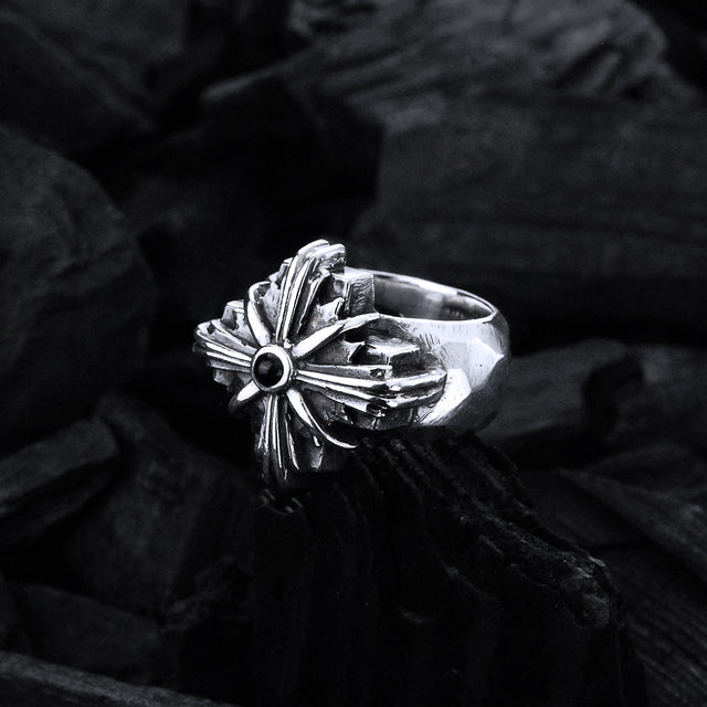 Silberring mit griechischem Kreuz mit Morgenstern und einem Onyx in der Mitte und einem schlichten, rauen, facettierten Ring. Das zeitlose Design und der raffinierte Look dieses Stücks verbinden sich mit einer reichen Geschichte und schaffen so ein wirklich einzigartiges Stück für Ihre Schmuckkollektion.