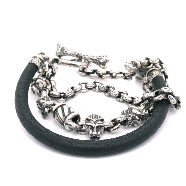 Silberarmband LÖWENKOPF auf dreireihigem Armband mit 1 Leder und 2 Ketten und einem kleinen Löwenkopf. Verschluss mit Knochen