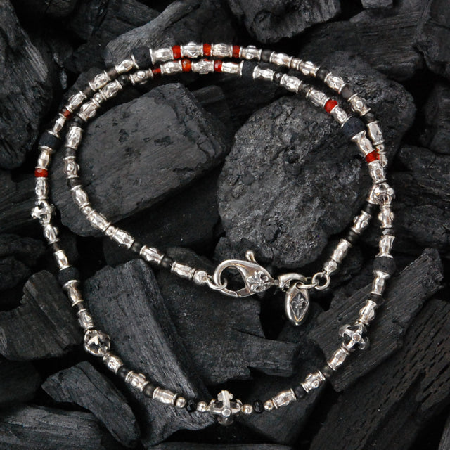 Grob facettierte, gehämmerte oder genietete Mini-Röhren und Mini-Kugeln. Röhrengröße 7 x 5 mm aus Sterlingsilber, kombiniert mit Onyx, Rauchquarz, Lava und Karneol und einer Blades Cross-Kugel in der Mitte und auf beiden Seiten. Schlank, aber mit Gewicht. Wunderbar zu tragen.