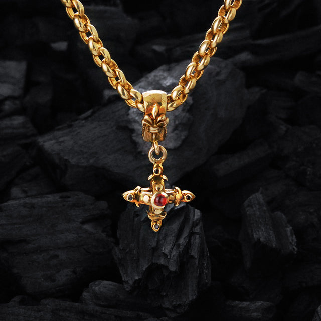 Smith-Kreuz-Anhänger aus 18-mm-Silber + 4 kleine schwarze Diamanten und ein Granat – ebenfalls mit 24-Karat-Vergoldung