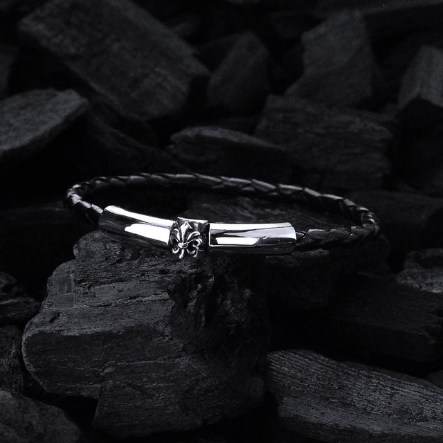 Entdecken Sie Ihre dezente Etravaganz mit diesem silbernen Lederarmband PLAIN SLIM – entworfen für 3,5–4,0 mm dickes geflochtenes Leder mit schlichtem Gelenkverschluss und Mini-Lilien-Detail.