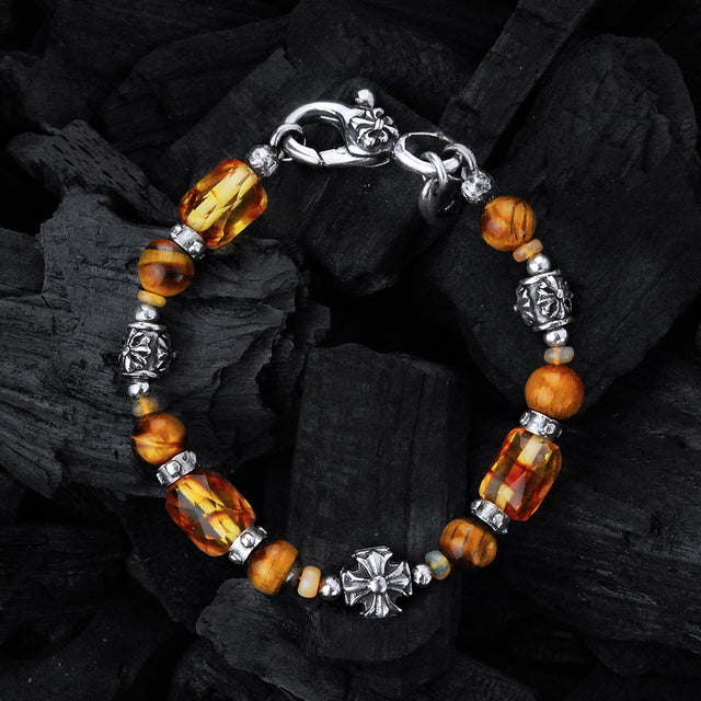 Silver Bracelet MALTESER CROSS and AMBER ROCKS with Beads and Opals