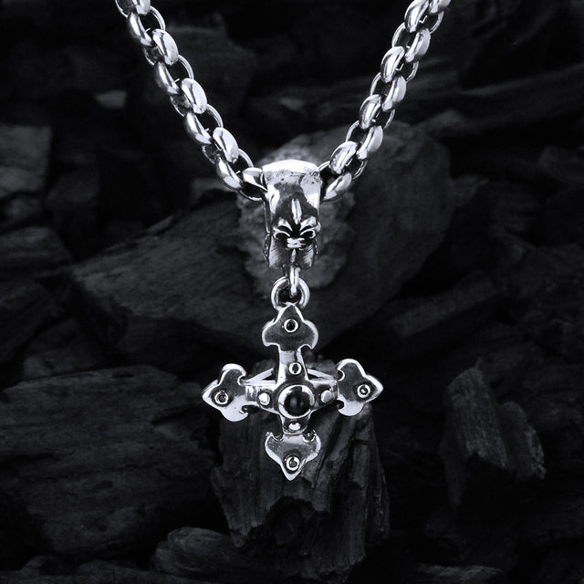 Dieser exquisite Silberanhänger verfügt über ein Klingenkreuz, das vier schillernde schwarze Diamanten umfasst, mit einem zentralen Stein als Krönung. Mit seinem 30-mm-Plus-Schlaufendesign greift dieses faszinierende Stück die kunstvollen schmiedeeisernen Details antiker Burgtore auf.