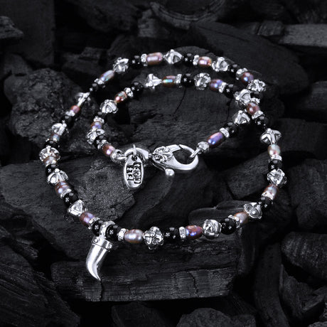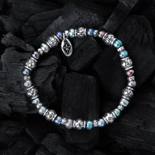 Ein exquisites Armband, verziert mit 6 mm großen schwarzen Perlen und silbernen Fässern, verziert mit Drachenschuppen. Gönnen Sie sich die Opulenz dieses Stücks mit seinen luxuriösen Materialien und dem aufwendigen Design.