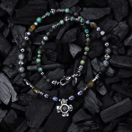 Erlesener Onyx, Lava, Hämatit, Labradorit und echte schwarze Perlen zieren ein prächtiges griechisches Achteck-Kreuz als Herzstück und schaffen eine unbestreitbare Aura von Luxus.