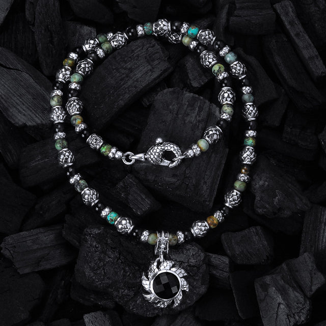 Elevate your style with this exquisite necklace featuring silver barrel tubes adorned with intricate dragon scale patterns, adding a unique textured allure. The centerpiece, a flamed sun motif embellished with matching dragon scale details, complements the combination of lustrous beads and pearls for a striking contrast of elegance and strength. This sophisticated design blends mythical inspiration with timeless beauty, making it a captivating accessory for any refined wardrobe. Perfect for expressing individuality with an artistic edge, it promises to enhance both casual and formal ensembles with its distinctive charm and craftsmanship.