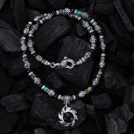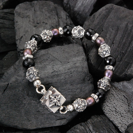 Ein exquisites Armband, verziert mit 6 mm großen schwarzen Perlen und silbernen Fässern, verziert mit Drachenschuppen. Gönnen Sie sich die Opulenz dieses Stücks mit seinen luxuriösen Materialien und dem aufwendigen Design.