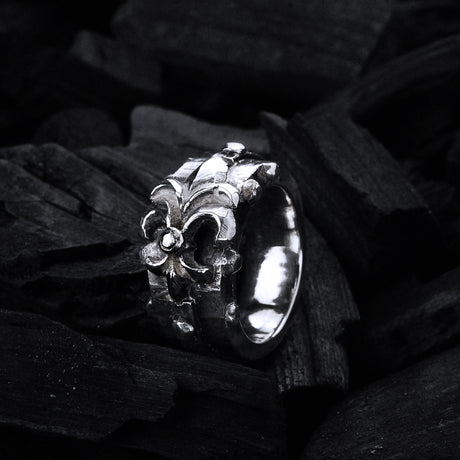 €19800Grundpreis /Nicht verfügbarSilberring mit facettiertem Körper und Nieten sowie gerader Lilie mit Meteorit