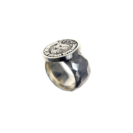 €25900Grundpreis /Nicht verfügbarSilberring ELFIN SHIELD-Münze auf rauh facettiertem Band