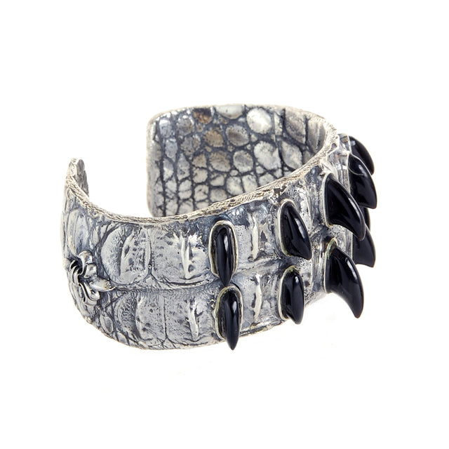 This audacious bangle channels raw rockstar energy with genuine saltwater crocodile skin—textured back exterior meets supple belly interior. Featuring dual rows of striking horn claws that command attention, it's sized for medium wrists at 19.5 cm. A statement piece for those who refuse to blend in.