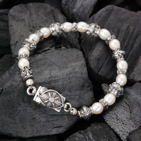 Silberarmband mit 8 mm großen Kreuzkugeln und echten Perlen