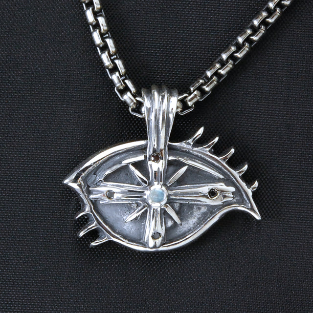 Elevate your elegance with the Silver Pendant The Third EYE View, featuring a moonstone or onyx in the middle and 4 small black diamonds set in polished sterling silver. This pendant embodies the power of perception, symbolizing an ability to glimpse beyond the obvious and explore what lies behind the horizon. Its intricate design merges contemporary sophistication with timeless symbolism, making it a compelling statement piece for those who value insight and refined taste. Perfect for any occasion, this pendant not only enhances your style but also serves as a subtle reminder of curiosity and vision that transcends the ordinary.