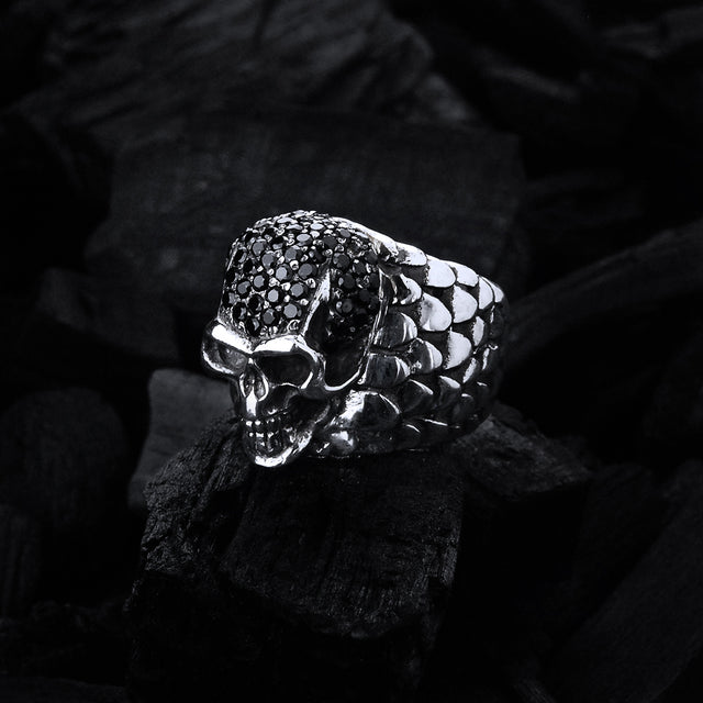 Schmücken Sie Ihren Finger mit diesem gewagten silbernen Totenkopfring, der mit schwarzem Zirkonia Steinen im Pave und dem aufregenden Drachenschuppenband schimmert!