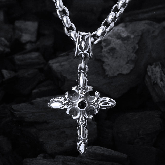 Silver Pendant CRESCENT CROSS in GARDEN AT NIGHT. 40 mm Silver Cross with black or white Zirkonia plus Loop.