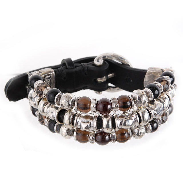 Silver and Leather Bracelet with adjustable size closure for 15mm leather strap with halfround facetted buckle. Silver beads Onyx and Smoky Quarz or Turquoise and Coral and middle strand with Pyramides silver tubes. Wow, that´s really special. All good things come in threes.
