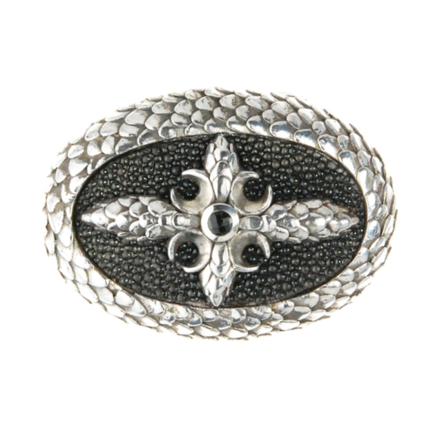 Silver Belt Buckle Oval Dragon Scales Stingray Leather and CrescentCross