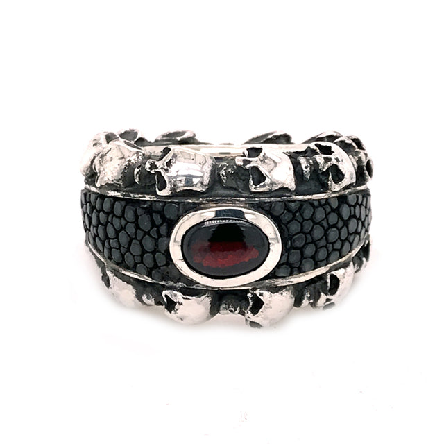 Silver Ring Oval Stone and SKULLS Frame with Searay Leather Band